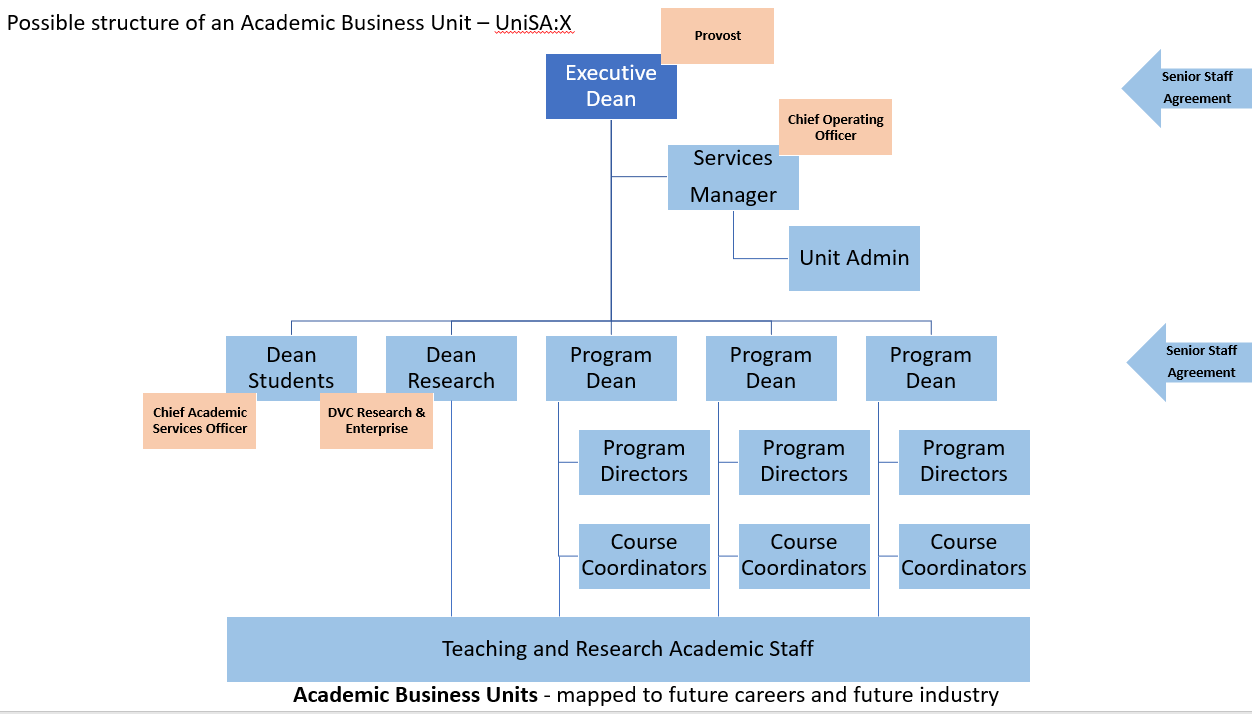 It’s got a placeholder name – UniSA:X – where X describes what it is. And what it is will be described by us, working together, to cluster our programs in logical and innovative ways – to pivot our structure and organisation around our core products. And to organise ourselves in this fashion.