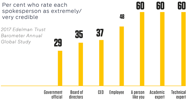 The 2017 Edelman Trust Barometer shows public trust in media fell to an all-time low in 17 countries and trust in institutions of government, CEOs, business and NGOs to do the right thing, also dropped. Equally troubling, the barometer shows that independent experts and academics are regarded as no more reliable for facts as another person who is “just like you” and search engines are now regarded as a more credible source than anything that has been “edited by humans”.