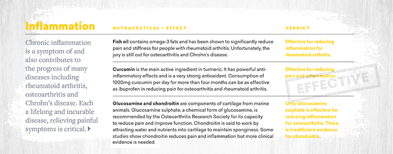 “In our study, we reviewed the most commonly used nutraceuticals claiming to treat the most prevalent health conditions, and found that the most consistent outcomes related to reductions in cholesterol levels, in blood pressure, and improvements in the control of blood glucose levels,” she says. “We also saw that disease activity was reduced in rheumatoid arthritis and osteoarthritis.