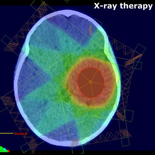 The dose distribution for conventional x-ray therapy is much higher, affecting more of the brain.