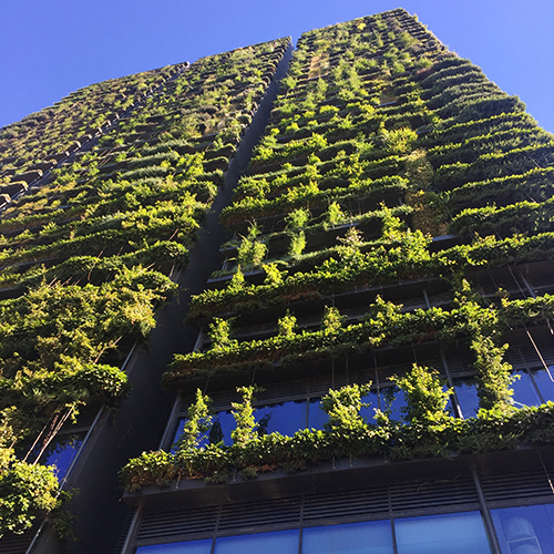 Unlike green facades, where roots are planted in the ground, with stems, leaves and flowers growing vertically on the wall, living walls are autonomous of the soil below, but are irrigated, rather than relying on rainfall.