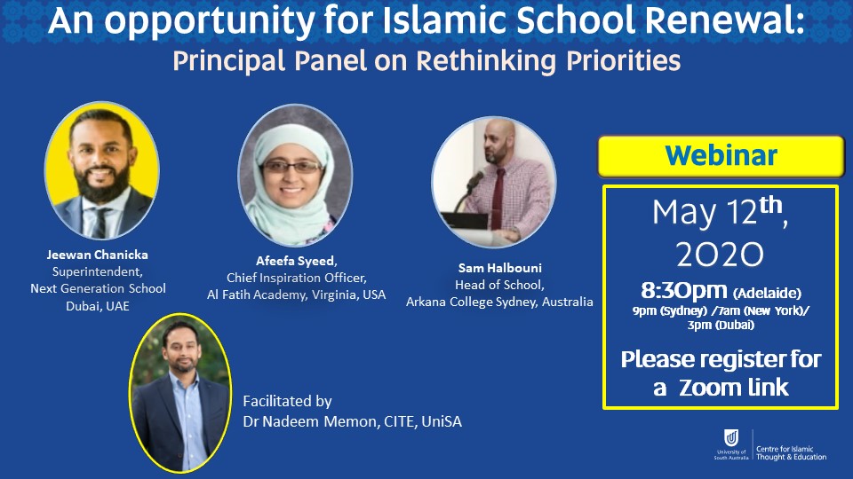 COVID 19 has led to unprecedented pressures and challenges for educators and schools. In this webinar, we engage with renowned school leaders in Islamic schooling from across the globe as they share their insights for our field in light of our “new reality”. We ask our school leaders, in this opportunistic moment, what opportunities present themselves to rethink our priorities and reimagine our collective effort of Islamic school renewal?