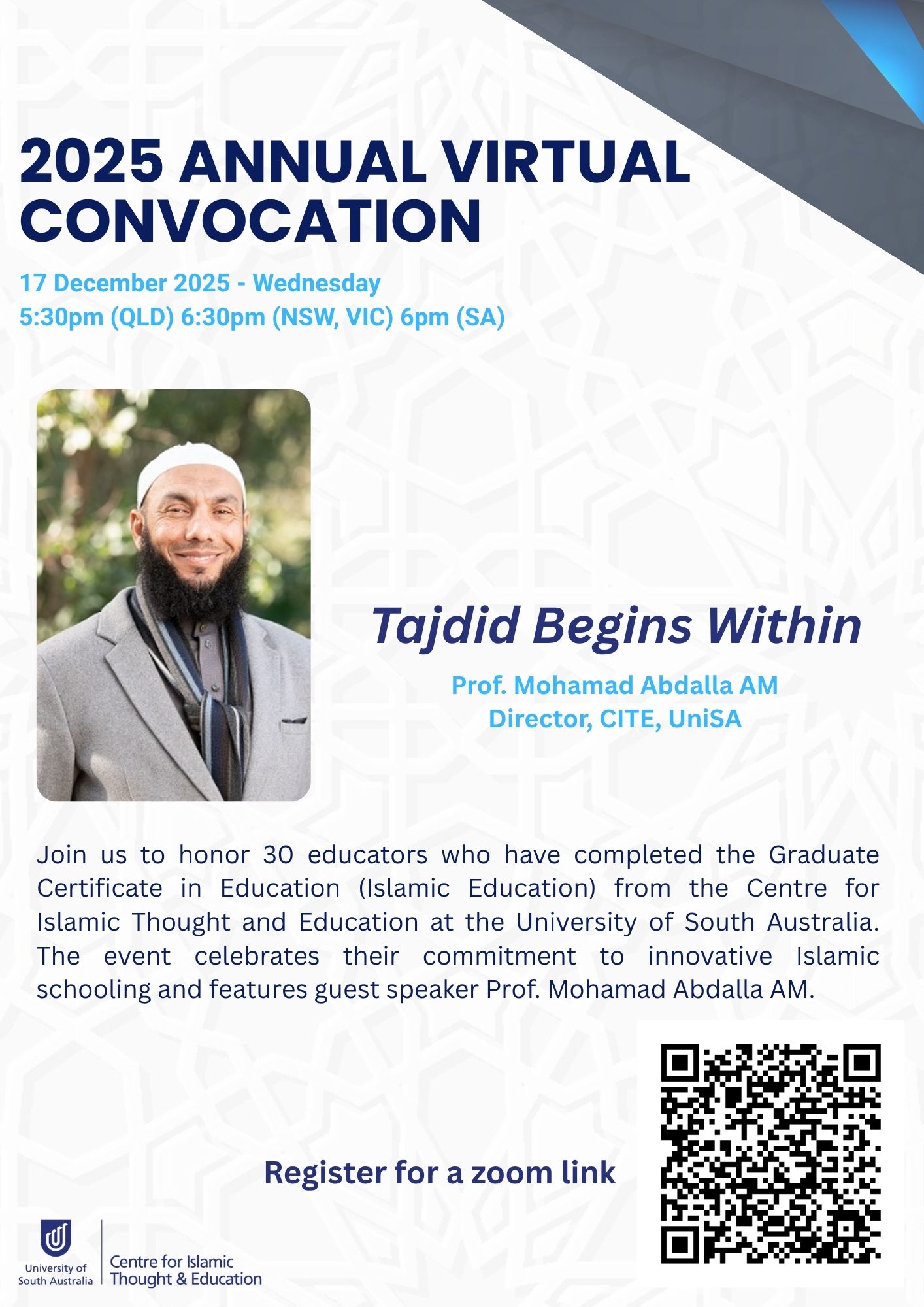 Join us to honor 30 educators who have completed the Graduate Certificate in Education (Islamic Education) from the Centre for Islamic Thought and Education at the University of South Australia. The event celebrates their commitment to innovative Islamic schooling and features guest speaker Prof. Mohamad Abdalla AM, Tajdid Begins Within